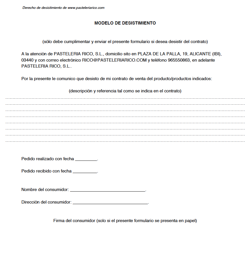 por correo electrónico dirigiéndose a RICO@PASTELERIARICO.COM o por correo postal a la