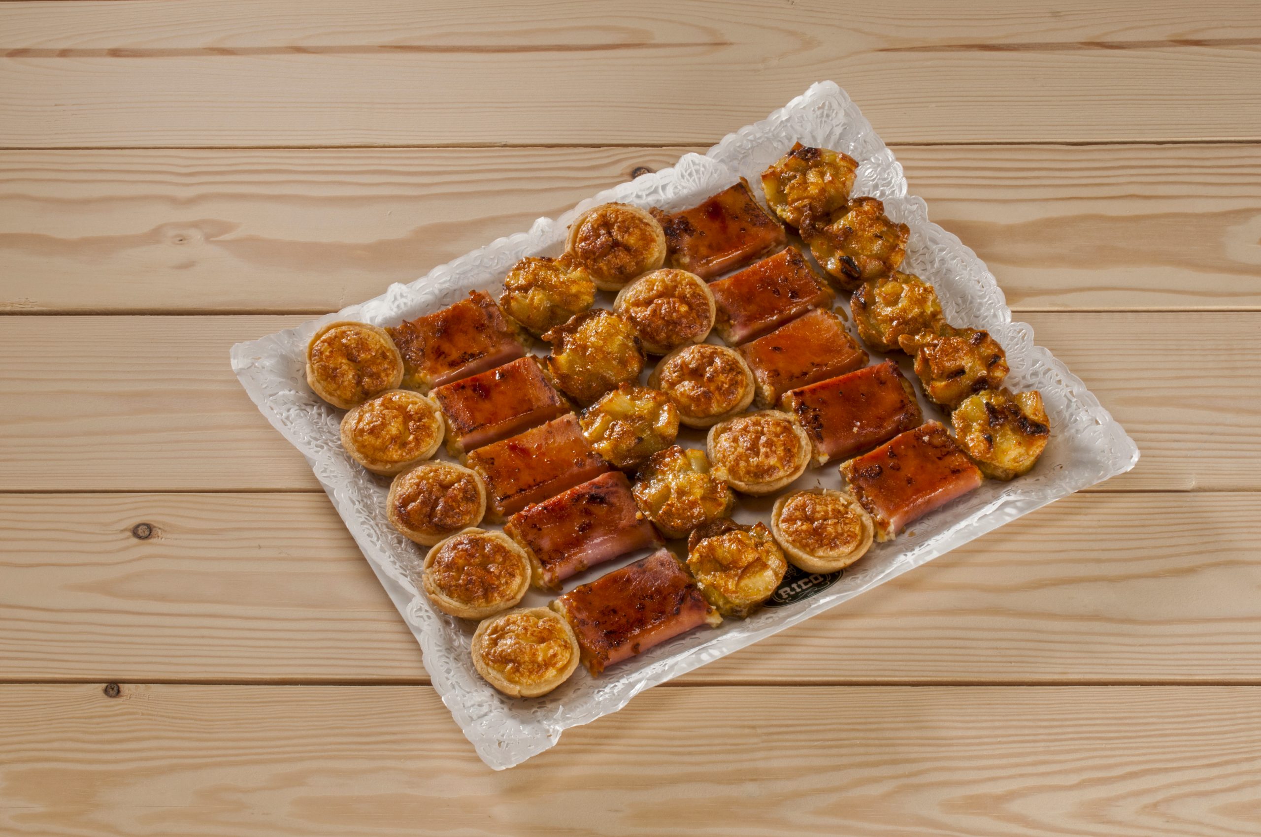 Bandeja de 10 mini quich loraine, 10 rollitos york al PX y 10 mini tortillas.