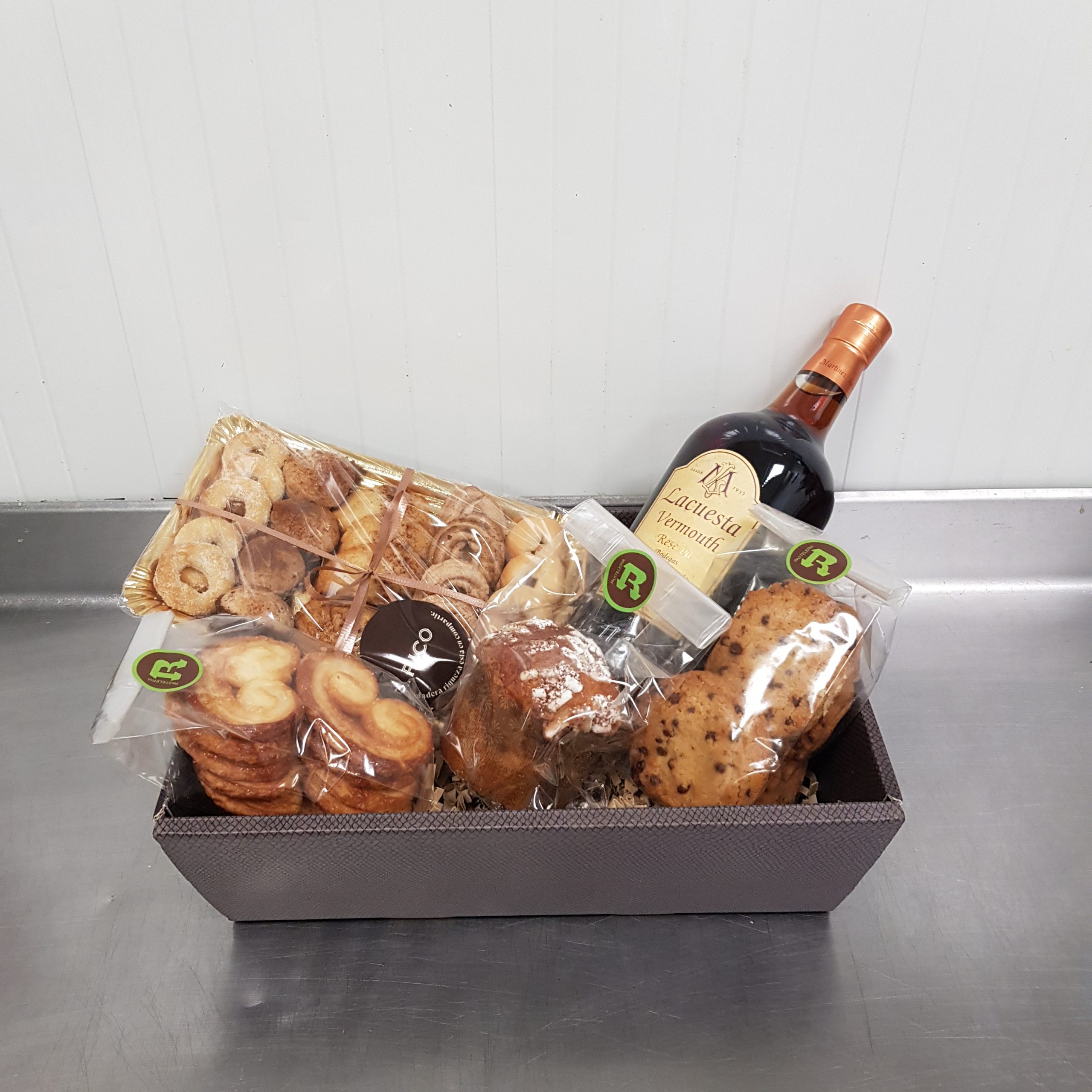 Pack que incluye : una botella de vermut reserva La Cuesta, un minipanettone, un bolsa de cookies, una bosa de mini palmeras y una bandeja de pastas caseras o de té.