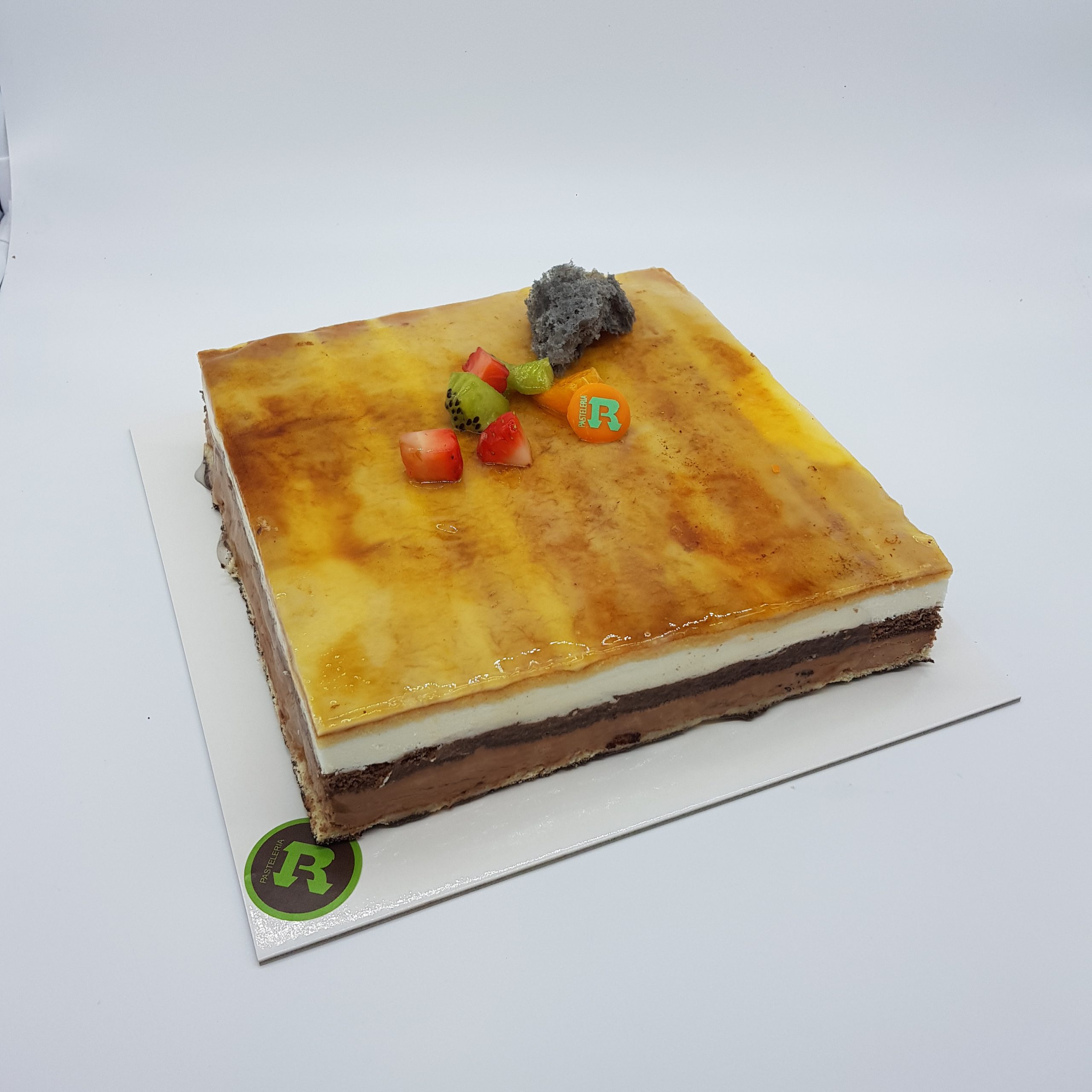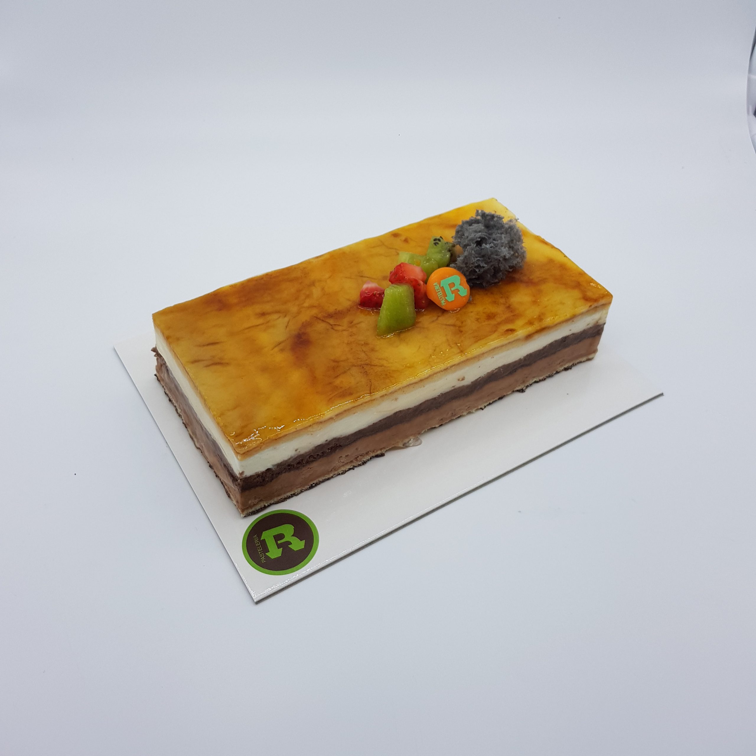 Compuesta por una combinación de capas de trufa y nata, entre bizcochos, acabado con una capa de crema caramelizada.